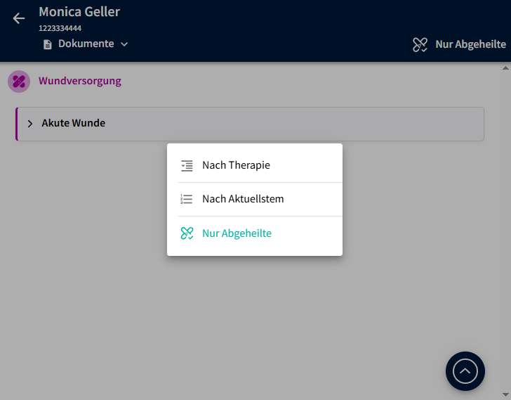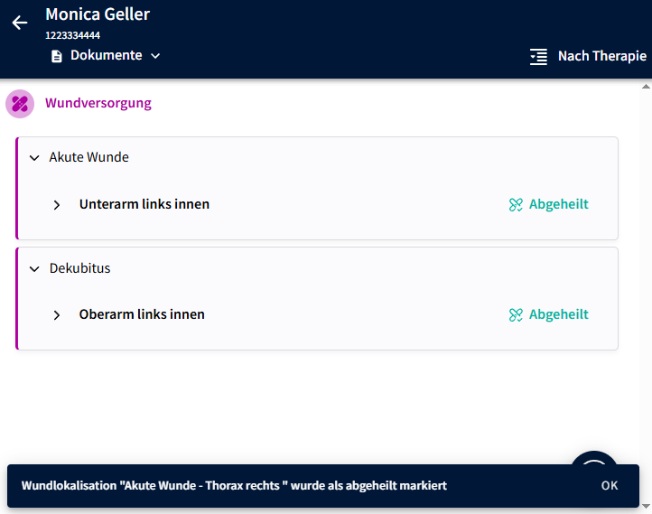 - Wird auf "Abgeheilt" geklickt, werden alle, zu der Wundlokalisation zugehörigen Dokumente, in den Abschnitt "Nur Abgeheilte" verschoben.