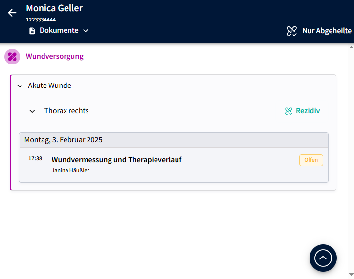 • Ist die Wunde wiederkehrend, kann die gesamte Dokumentation mit Klick auf "Rezidiv" zurück in die Standardansicht verschoben werden.