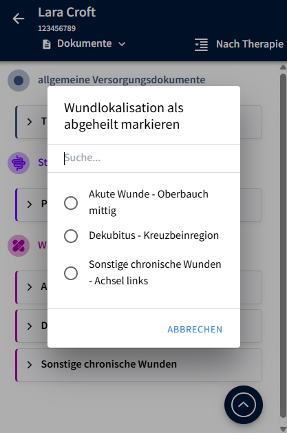 Es öffnet sich ein Dialog "Wundlokalisation als abgeheilt markieren", hier werden alle bei dem Patienten vorhandenen Wundlokalisationen aufgelistet.