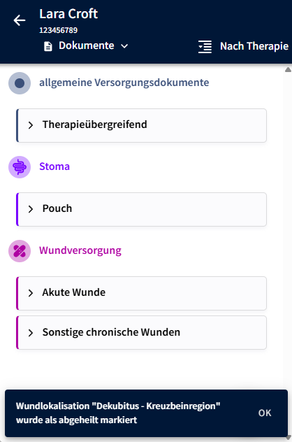 Die so markierten Wundlokalisationen werden dann aus der Ansicht "Nach Therapie" entfernt und sind dann in der Ansicht "Nur abgeheilte" sichtbar.
