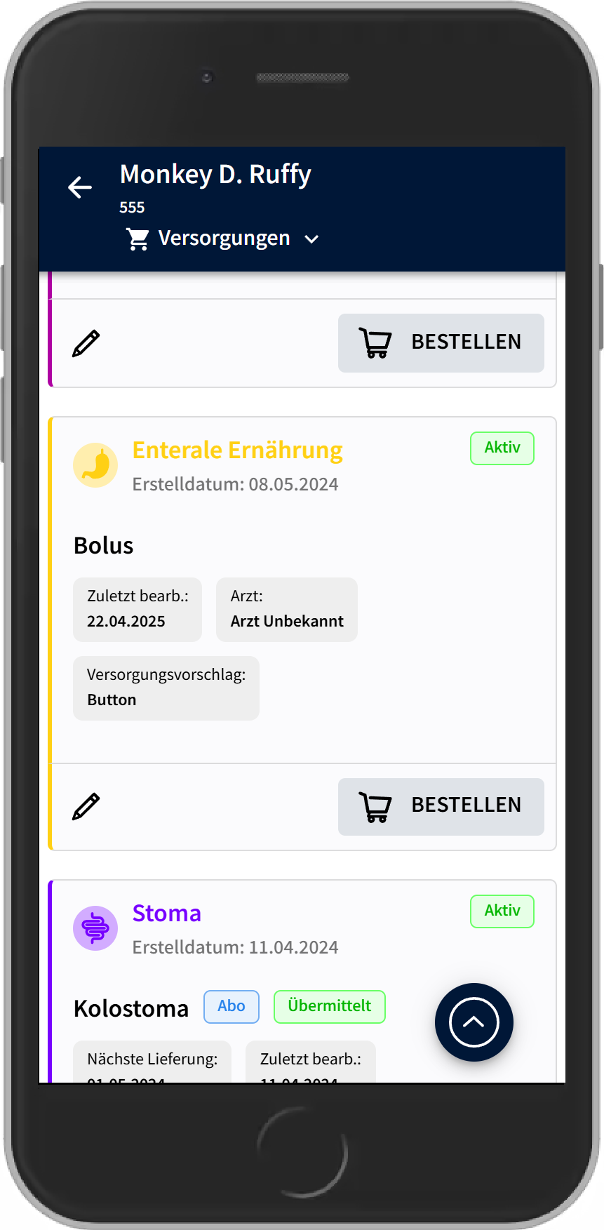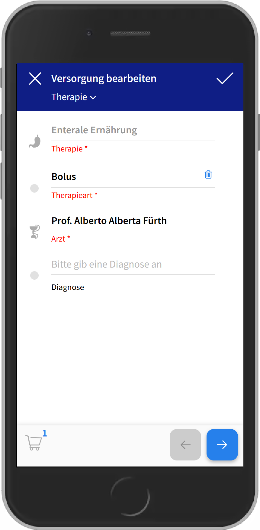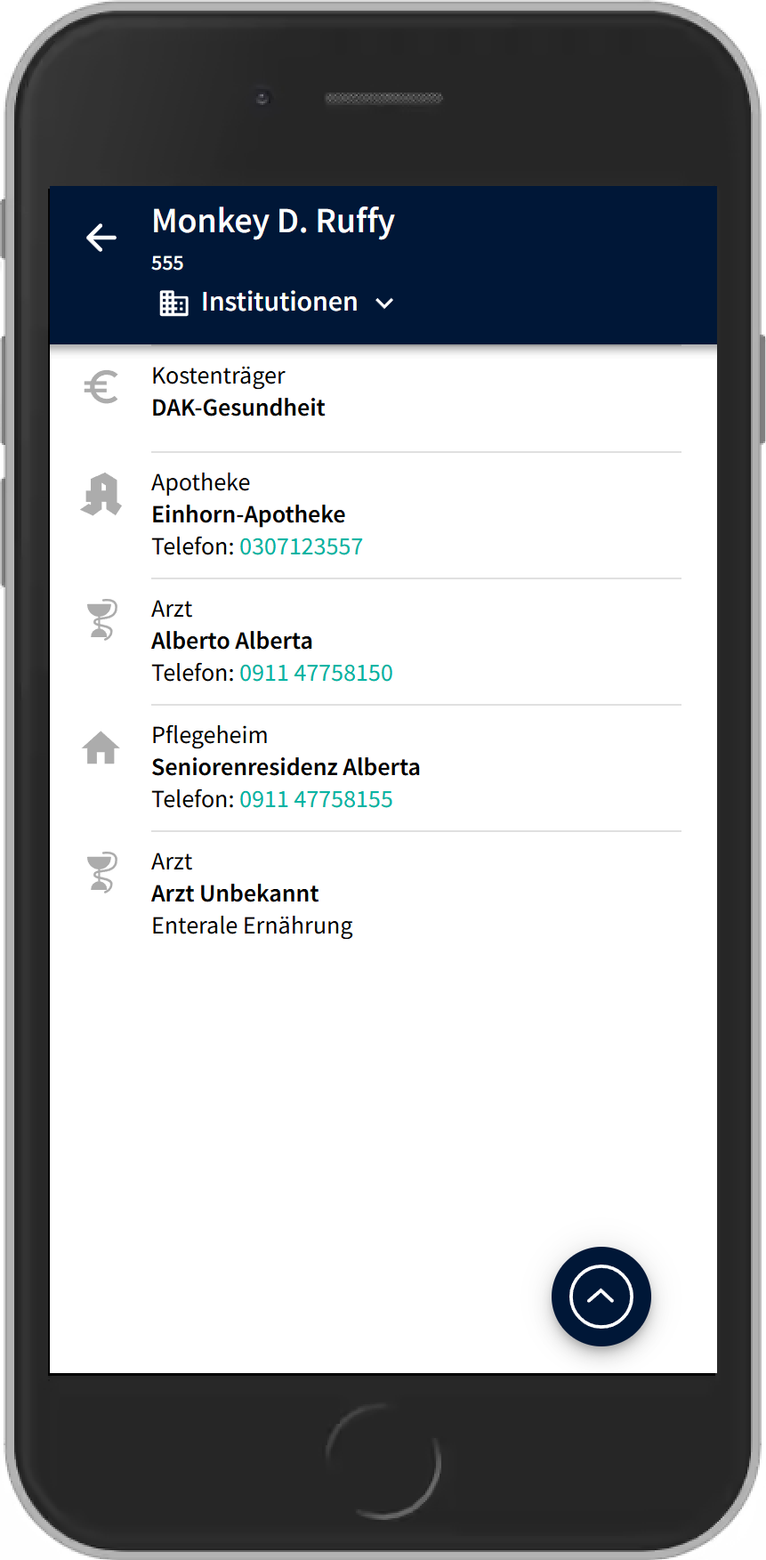 - Gibt es unterschiedliche Ärzte, wird das im Abschnitt "Institutionen" angezeigt, beim therapiespezifischen Arzt steht dann zusätzlich noch die Therapie (in diesem Beispiel "Enterale Ernährung").