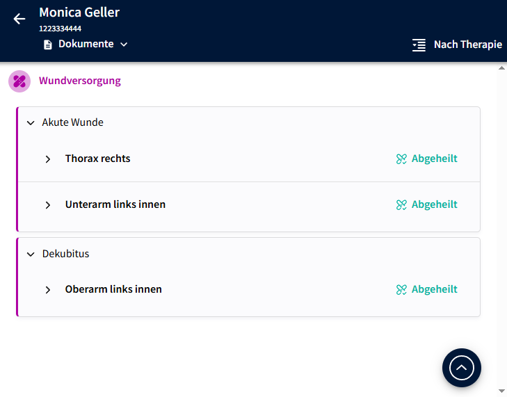 - Wird auf "Abgeheilt" geklickt, werden alle, zu der Wundlokalisation zugehörigen Dokumente, in den Abschnitt "Nur Abgeheilte" verschoben.