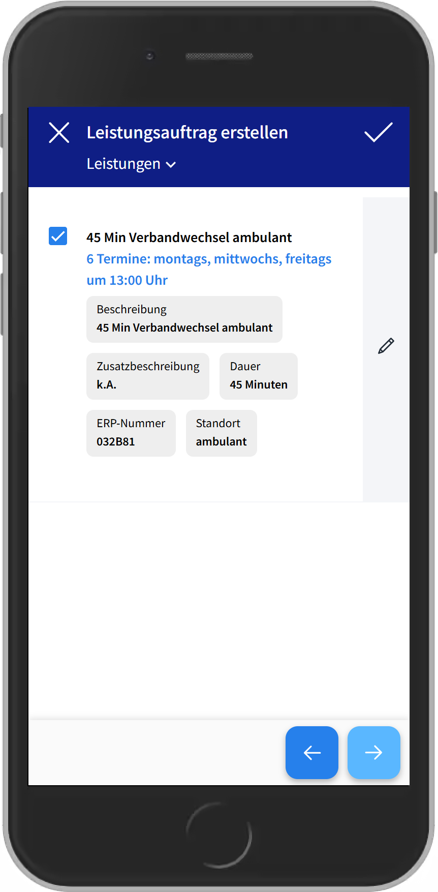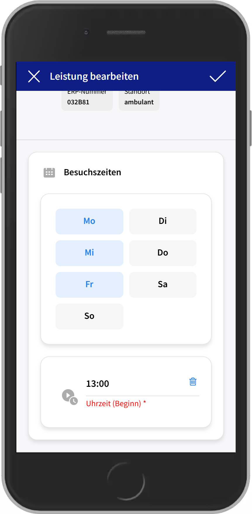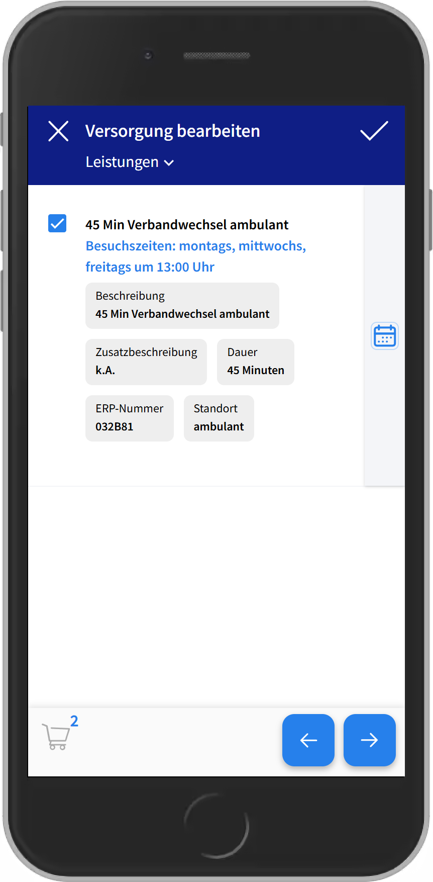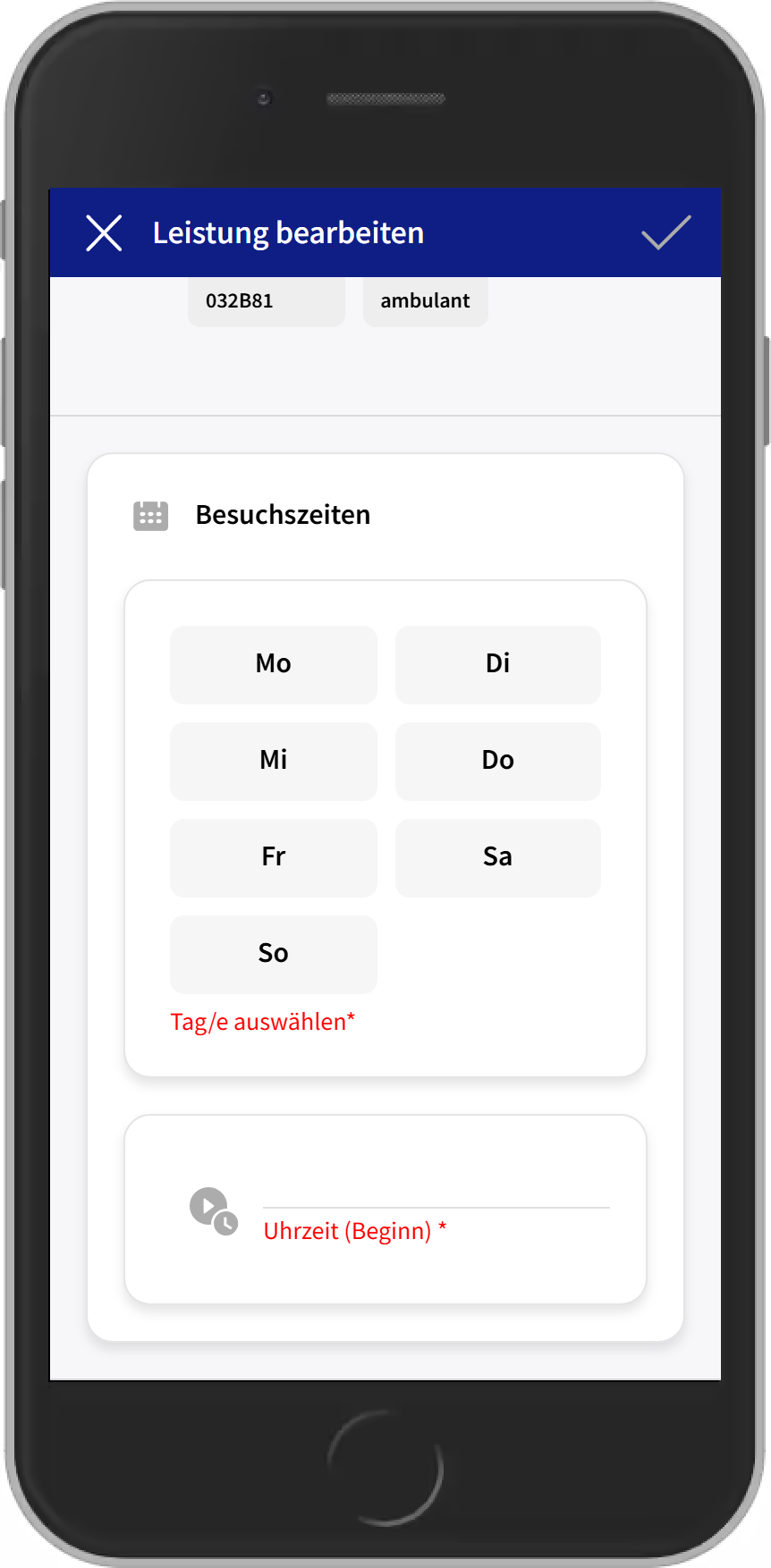 • 1) Beim Bearbeiten der Versorgung über das Kalender-Icon rechts die Leistung bearbeiten und die Besuchszeiten auswählen. Dafür einfach die gewünschten Tage anklicken und eine Uhrzeit eingeben.
