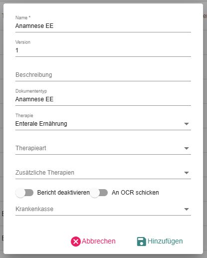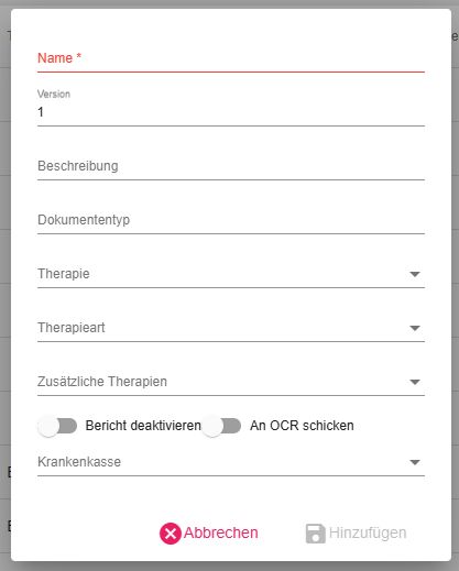• Zusäztliche Therapien: Soll die Dokumentenvorlage für mehrere Therapien angezeigt werden, können hier zusätzlich weitere Therapien ausgefüllt werden.
