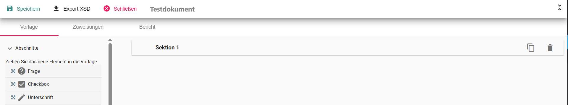• Export XSD: Das XML-Schema der Vorlage kann exportiert werden (normalerweise nicht relevant)