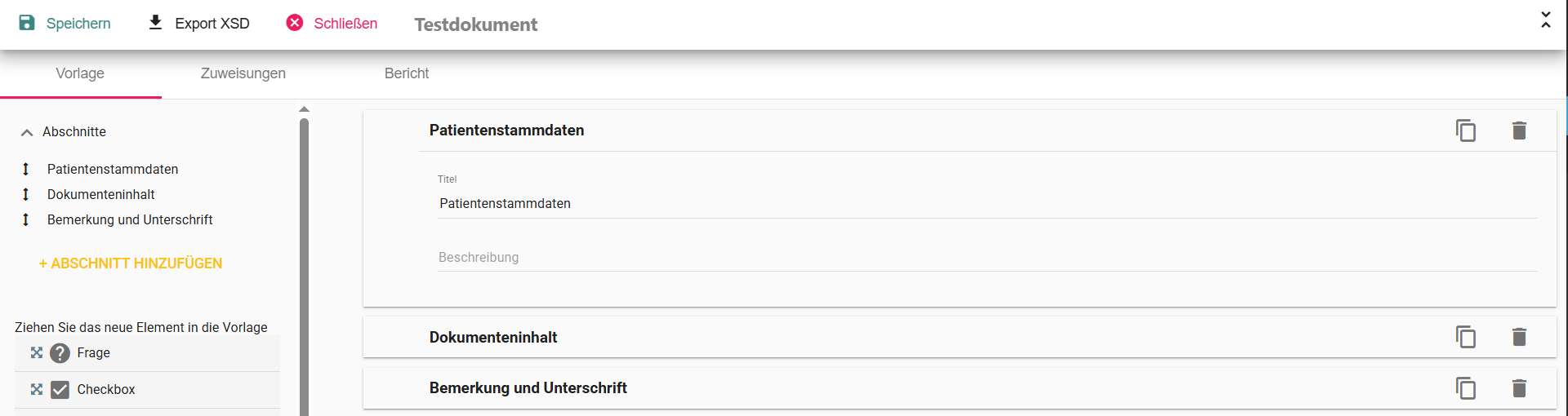 • Neue Abschnitte können mit Klick auf "Abschnitt hinzufügen" hinzugefügt werden und per Drag and Drop in der Reihenfolge verändert werden.