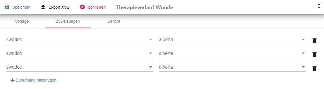 Wichtig: eine Zuweisung niemals leer lassen! Sollte diese doch nicht benötigt werden, einfach löschen (über das Mülleimer-Symbol ganz rechts) - wird diese nämlich (vollständig oder teils) leer gelassen, versucht Alberta verzweifelt eine Zuweisung beim Erstellen des Dokuments herzustellen und das Dokument kann nicht geladen werden .