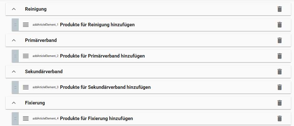 - In unserem Beispiel erstellen wir eine Versorgungsempfehlung für die Wundversorgung. Wir möchten, dass die User Produkte für die Wundreinigung, für den Primär- und Sekundärverband, sowie die Fixierung hinzufügen können. Im Formulargenerator schaut das dann folgendermaßen aus: