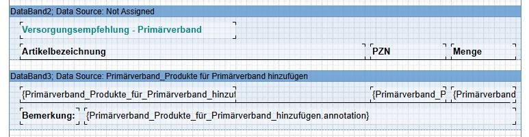 - Und im Bericht verwenden wir an dieser Stelle zwei Bänder. Einmal, als eine Art Überschrift (DataBand2) und als Tabelle (DataBand3).