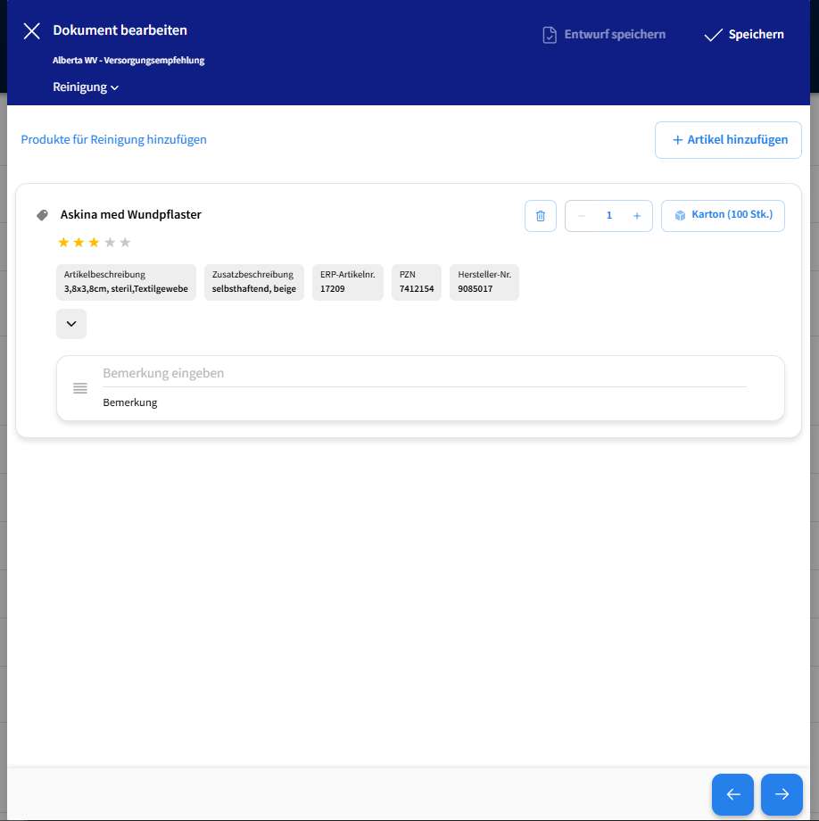 - In Alberta sieht das dann für den Benutzer folgendermaßen aus: über den Button "Artikel hinzufügen" kann auf die gesamte Artikelliste zugegriffen werden und nach Produkten gesucht werden. Wird ein Produkt ausgewählt, wird eine Kachel angezeigt mit den Produktdaten. Es kann die Menge geändert und eine Bemerkung ergänzt werden.