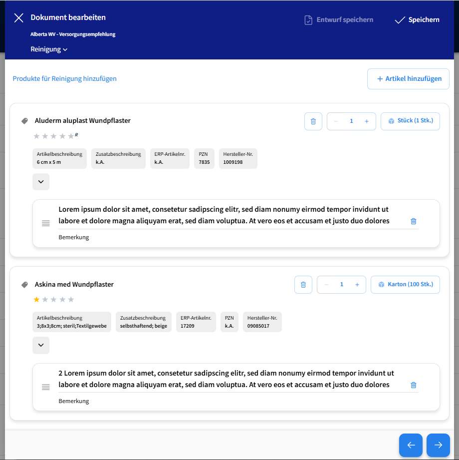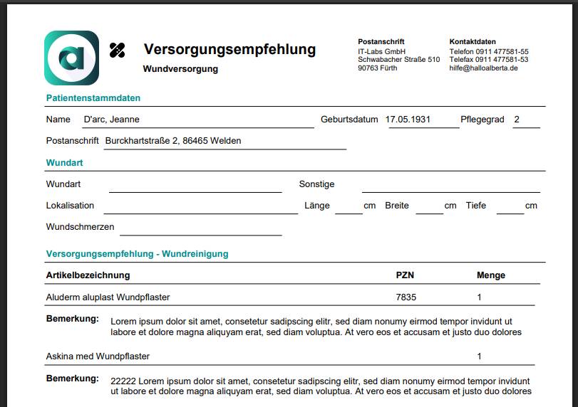 - So können z.B. Versorgungsempfehlungen, Bestellformulare oder Lieferscheine erstellt werden.
