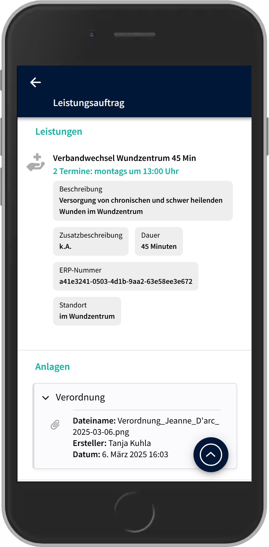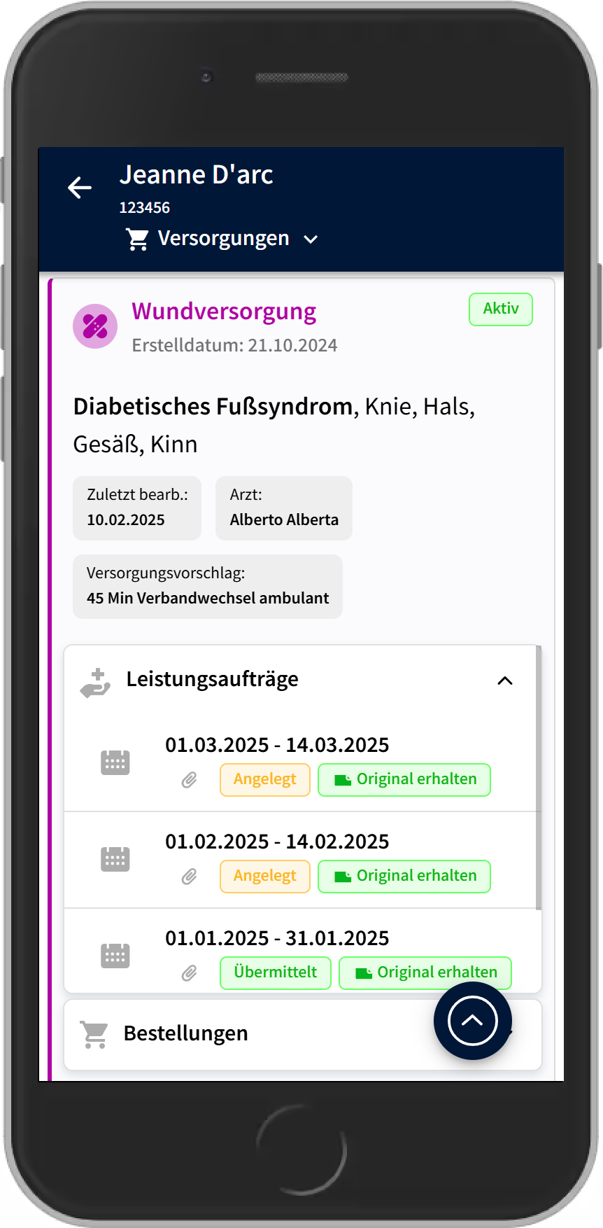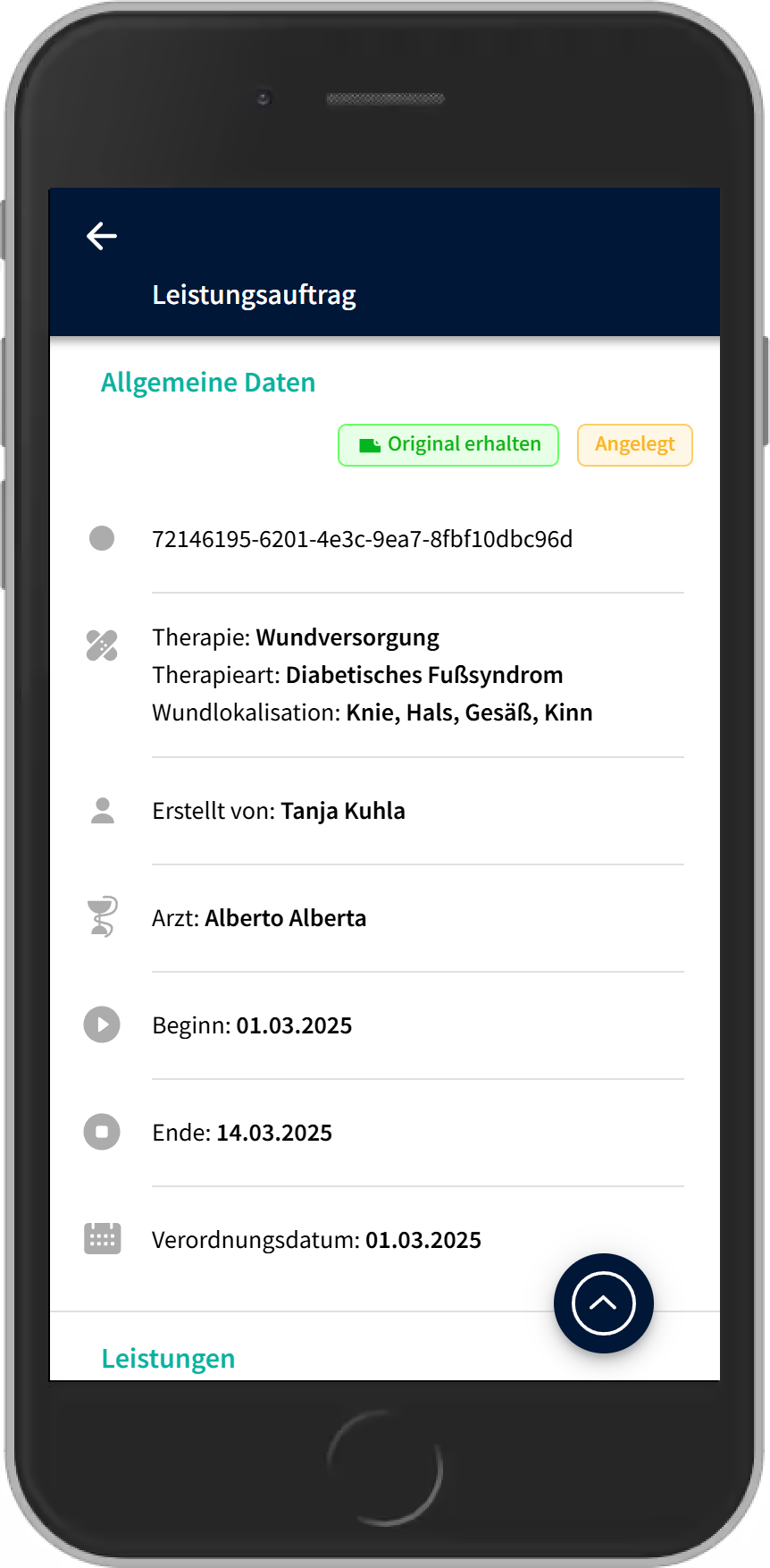 Sobald du die Verordnung vom Arzt zurückbekommen hast, kannst du diese direkt am Patienten, bzw. am Leistungsauftrag hinterlegen.