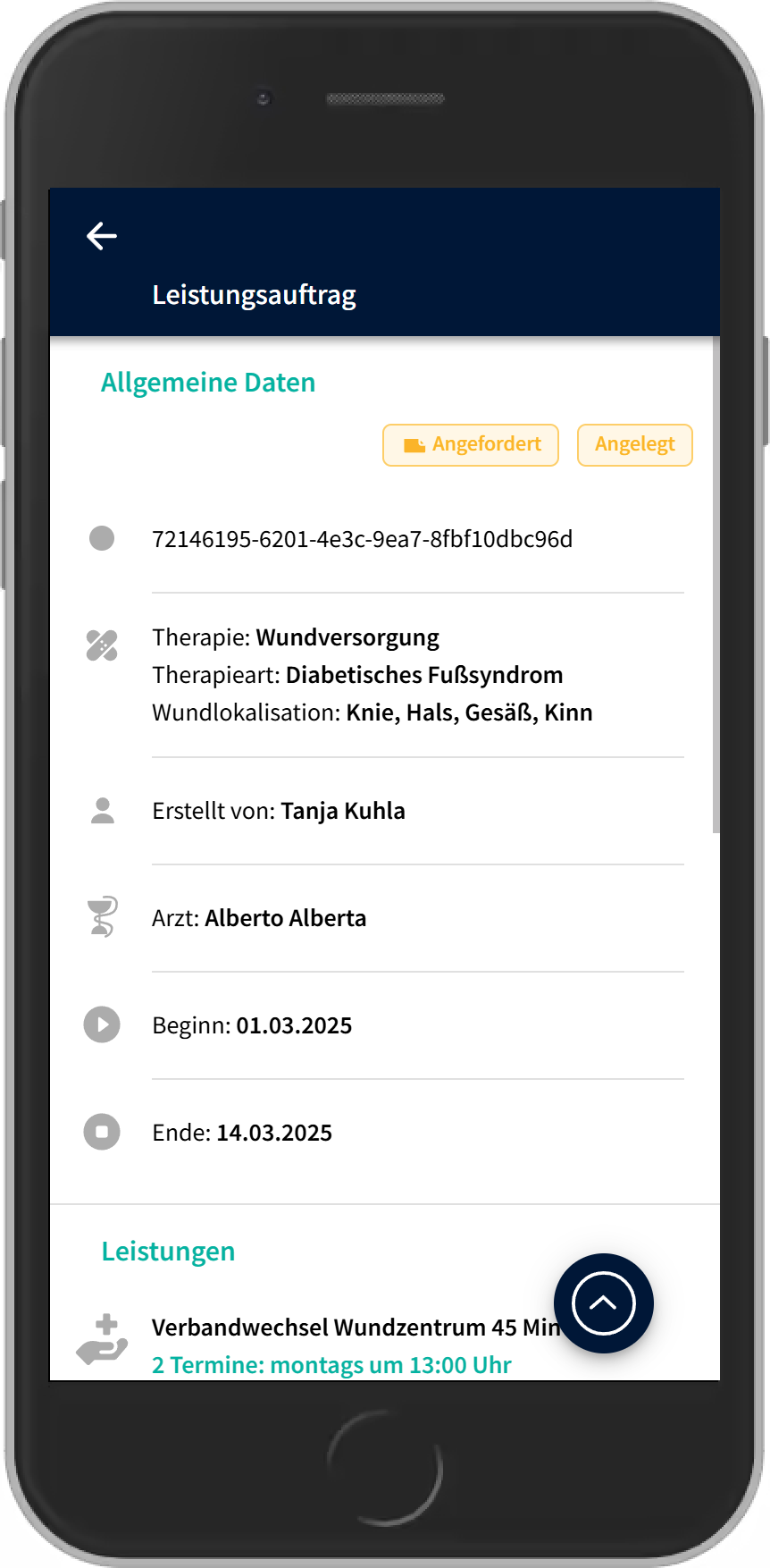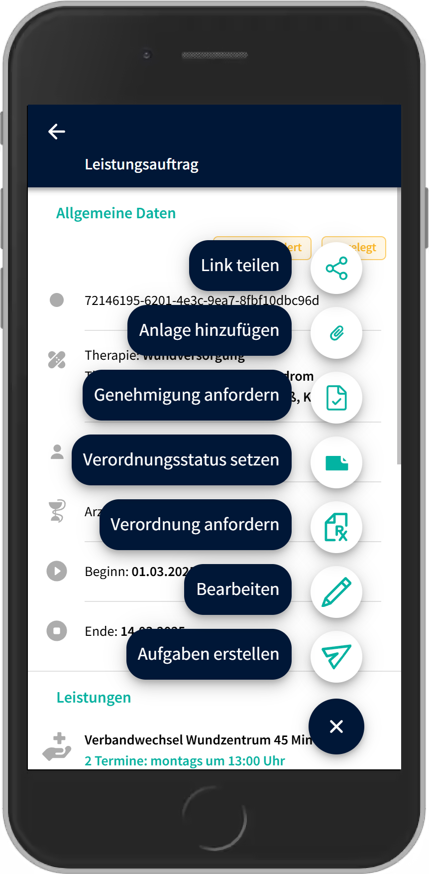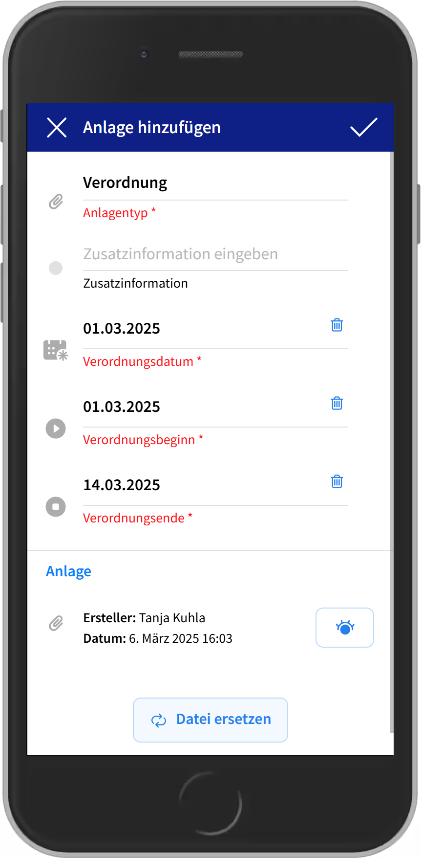 Sobald du die Verordnung vom Arzt zurückbekommen hast, kannst du diese direkt am Patienten, bzw. am Leistungsauftrag hinterlegen.