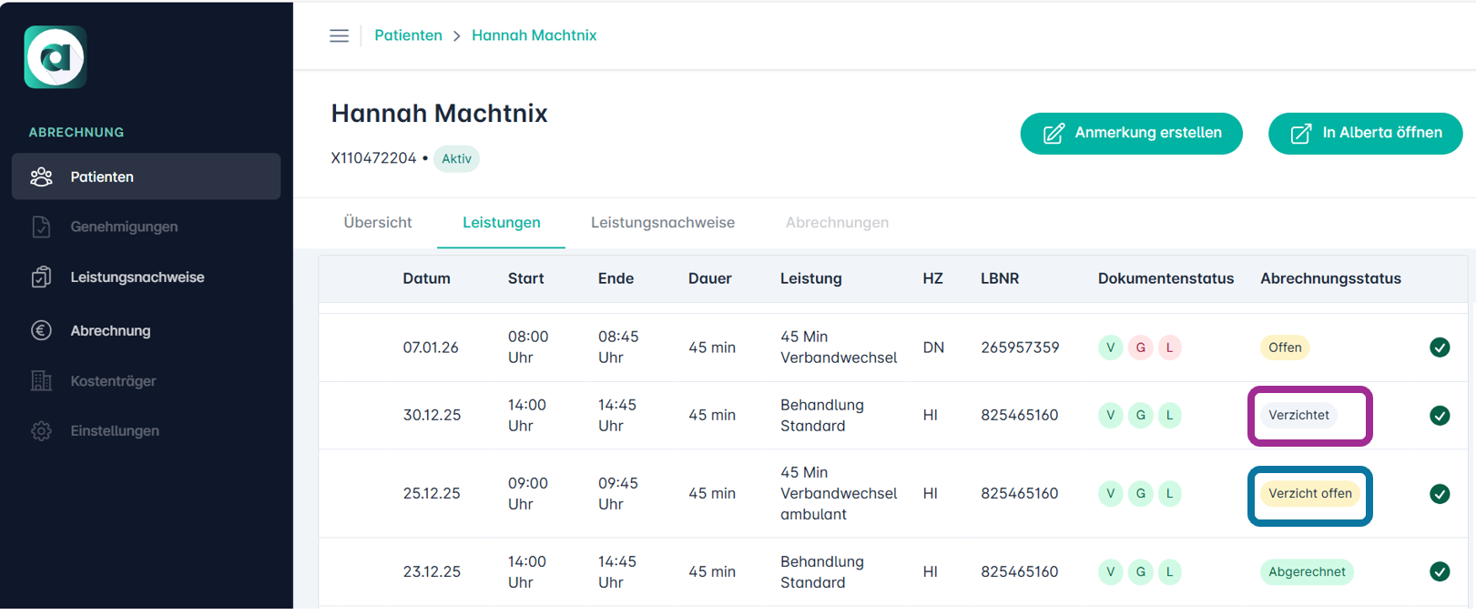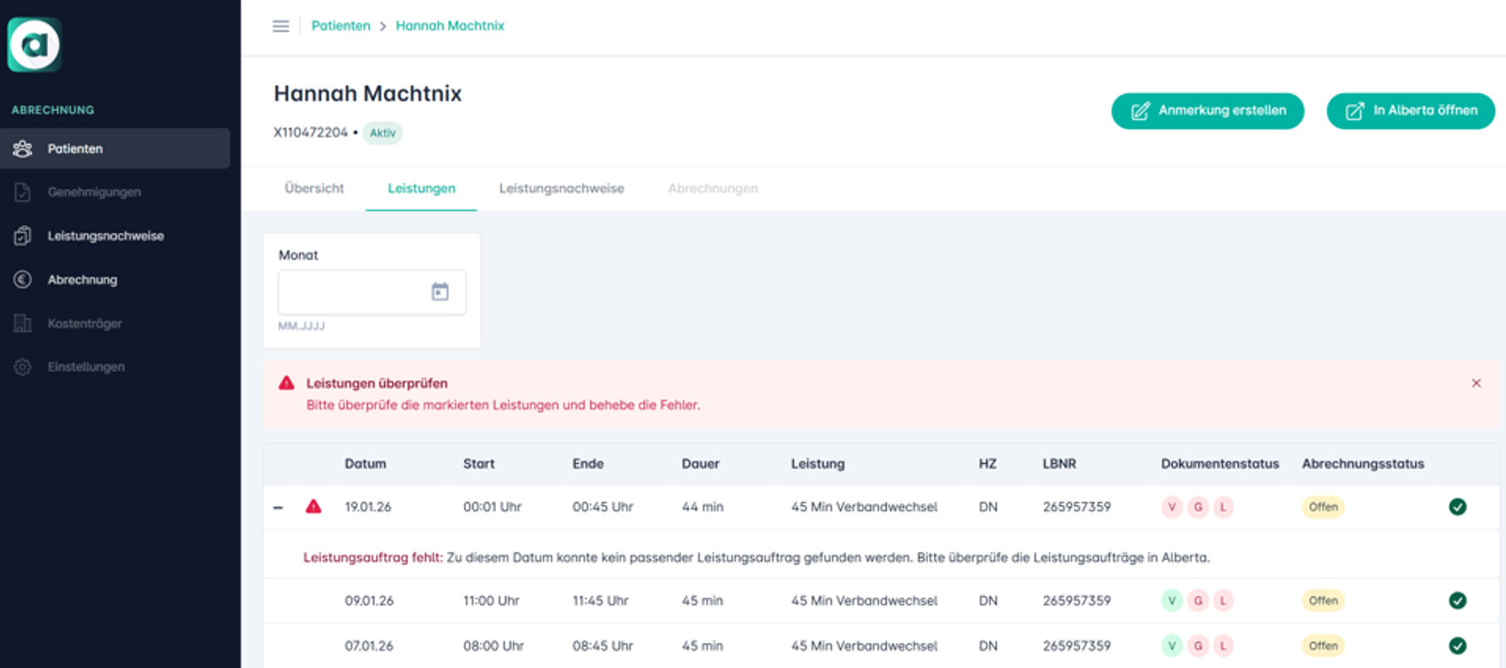 • Anzeige im Alberta Portal & Abrechnung: Bei der Abrechnung wird nun dynamisch nach der passenden Verordnung gesucht. Kann keine eindeutige Zuordnung erfolgen, wird der Fall sicherheitshalber aus dem Abrechnungslauf genommen, um Fehlbuchungen zu verhindern. Es erscheint zudem eine Warnung in der Leistungsübersicht zum Patienten.