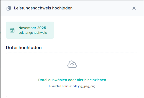 • Leistungsnachweise hochladen: Der Dialog zeigt Ihnen sofort den entsprechenden Abrechnungsmonat an.