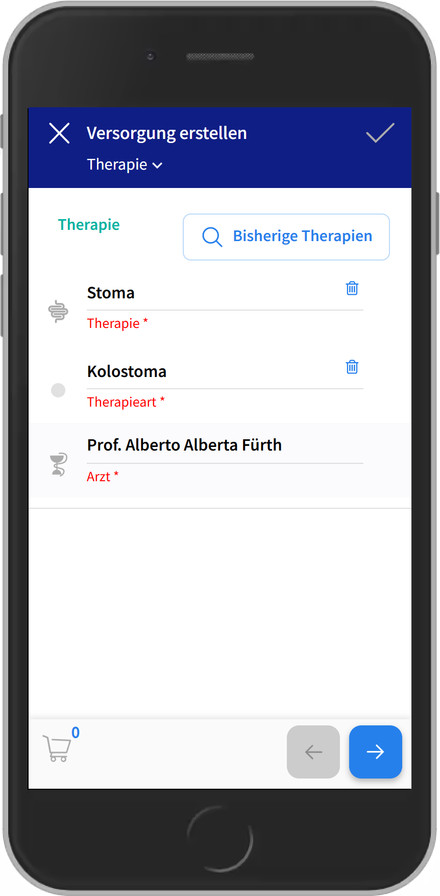 - Als erstes muss die Therapie und Therapieart angegeben werden, in unserem Beispiel wären wir Stoma und Kolostoma.