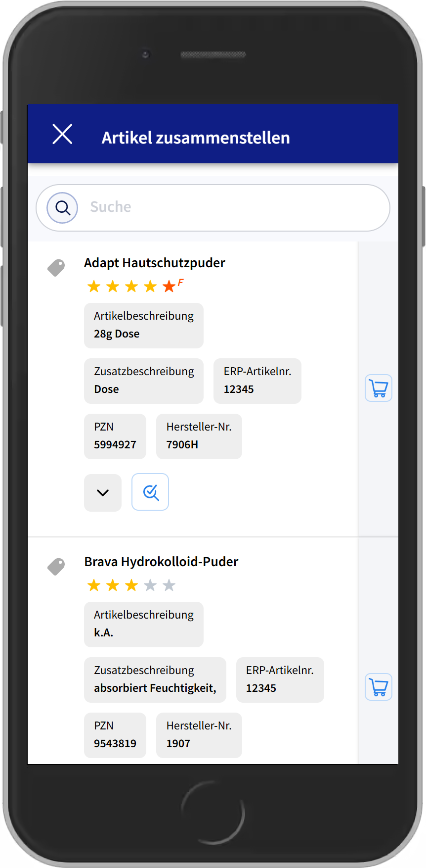- Wir würden davon abraten, zu allgemein zu suchen, z.B. in einer Wundversorgung nicht nach "Kompresse" da es dort ziemlich viele Suchergebnisse geben kann.