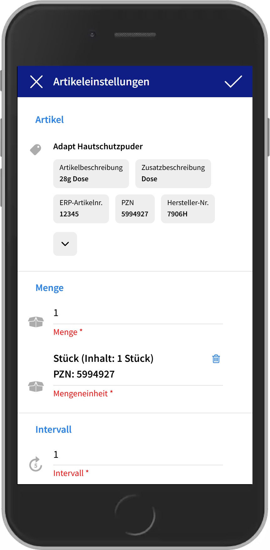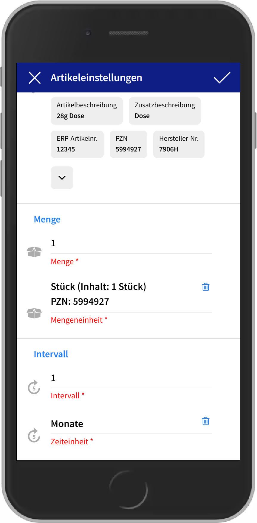 - Es öffnen sich nun die Artikeleinstellungen, hier gibst du die Menge und das Intervall an, d.h. die benötigte Menge des Produktes für einen bestimmten Zeitraum.