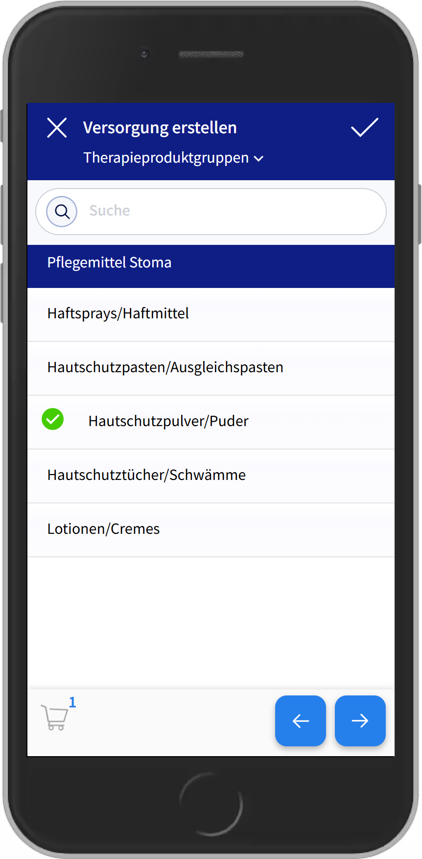 - Wenn du auf eine obergeordnete Produktgruppe klickst, z.B. "Pflegemittel Stoma" siehst du noch weitere Produktgruppen (die sogenannten Therapiewaregruppen), dahinter verstecken sich die Artikel - mit Klick auf eine Therapiewarengruppe öffnet sich die Artikelauflistung.