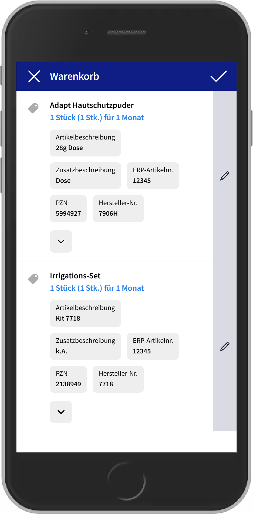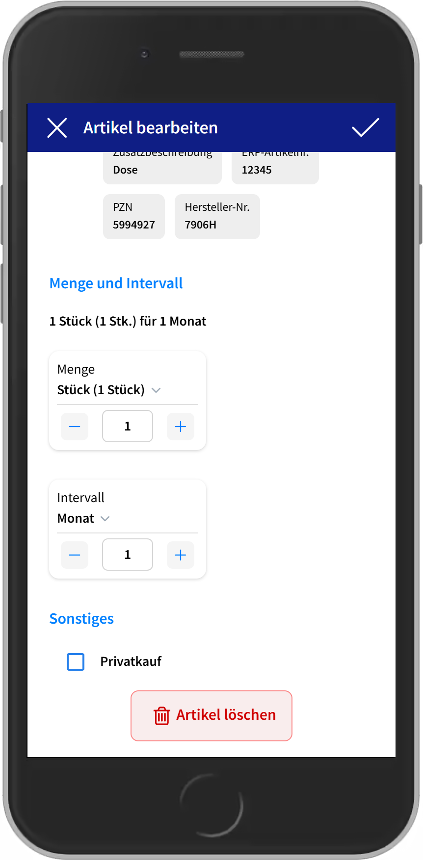 - Du kannst diese dort nochmal bearbeiten (über das Stift-Symbol) und die Menge/Intervall anpassen oder das Produkt aus der Versorgung entfernen.