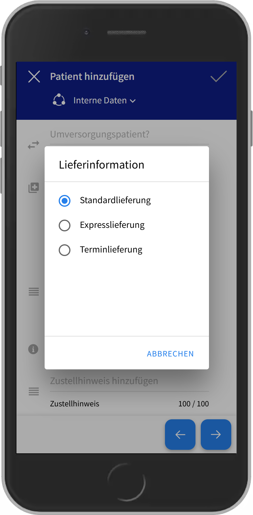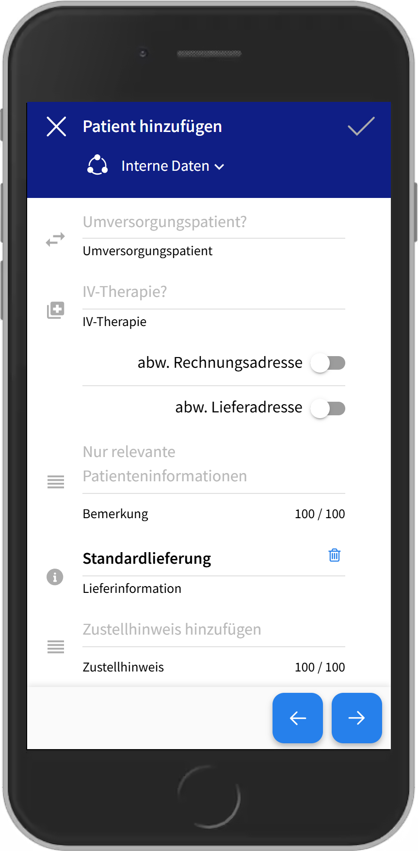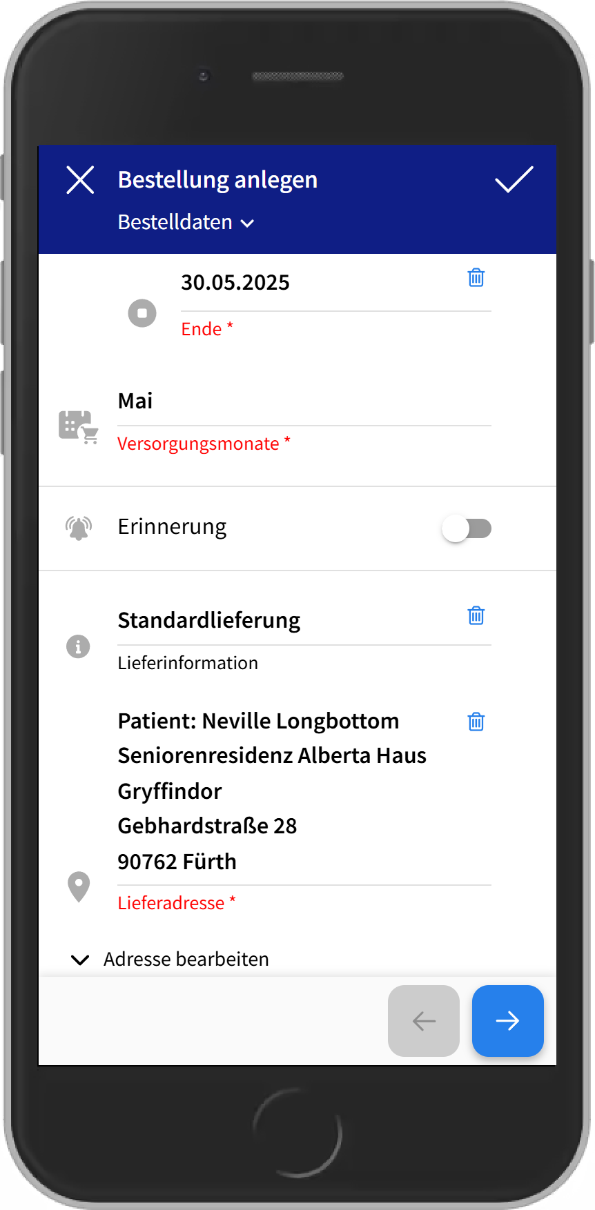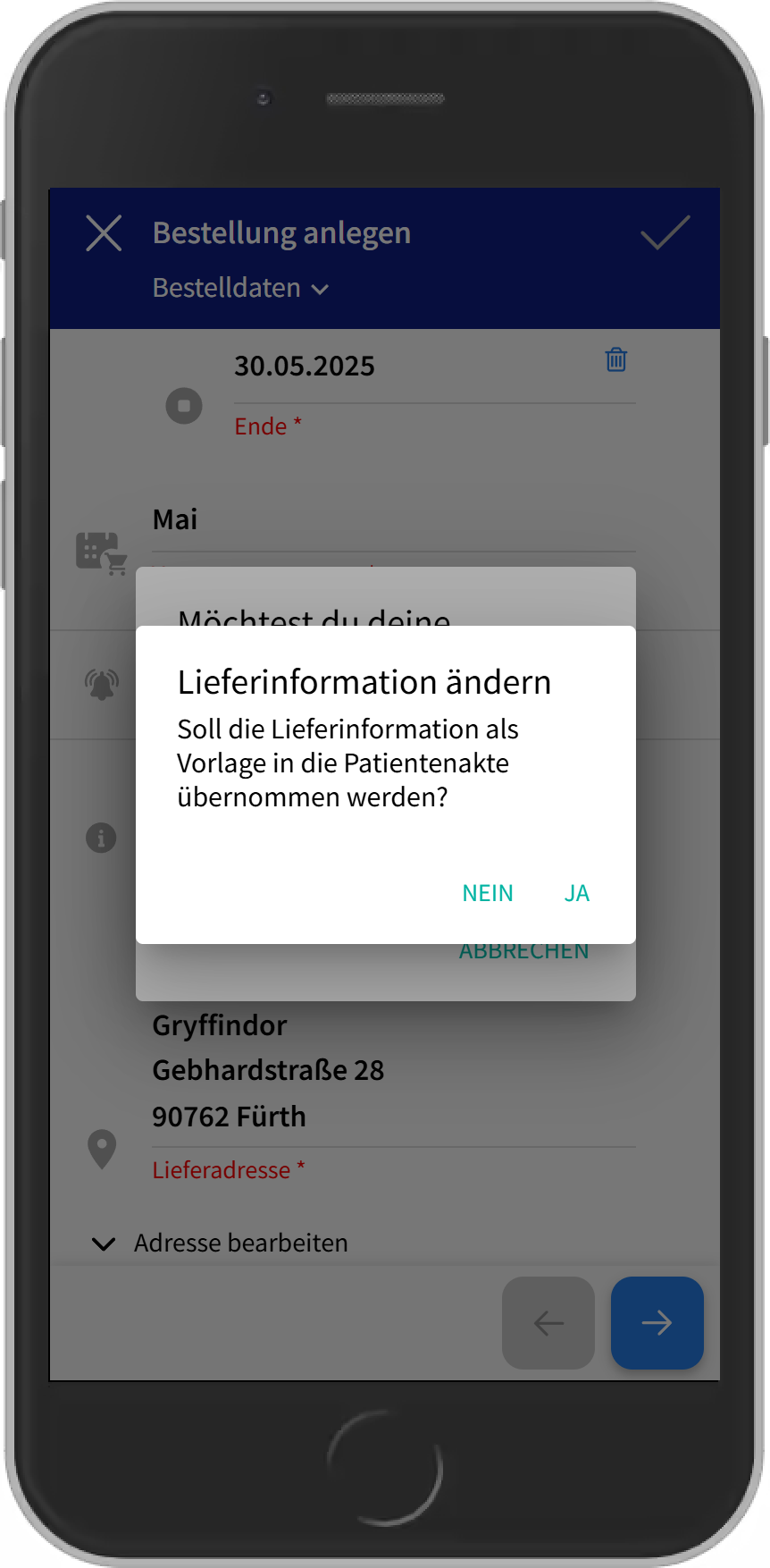 - Die in der Patientenakte hinterlegte Lieferinformation wird beim Erstellen einer Bestellung automatisch übernommen.