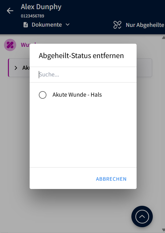 - Der Prozess, um den Abgeheilt-Status wieder zu entfernen wurde ebenso angepasst. Auch diese Aktion findet sich nun im Aktionsbutton "Abgeheilt-Status entfernen".