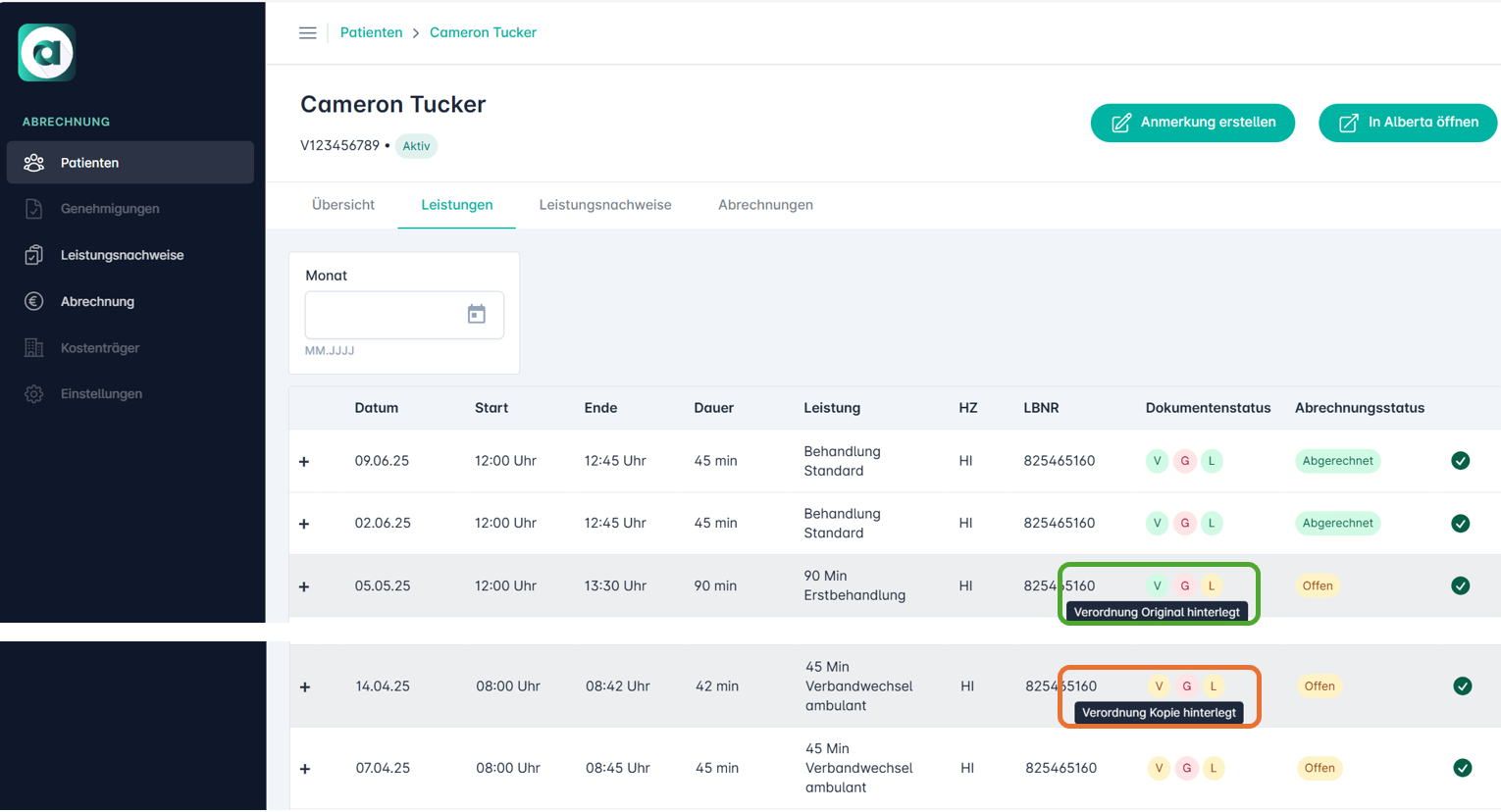 • Status "Gelb": Wird in Alberta eine "Verordnung Kopie" hochgeladen, wechselt der Statusindikator ("V") in der Leistungsliste ab sofort auf Gelb (statt bisher Grün).
