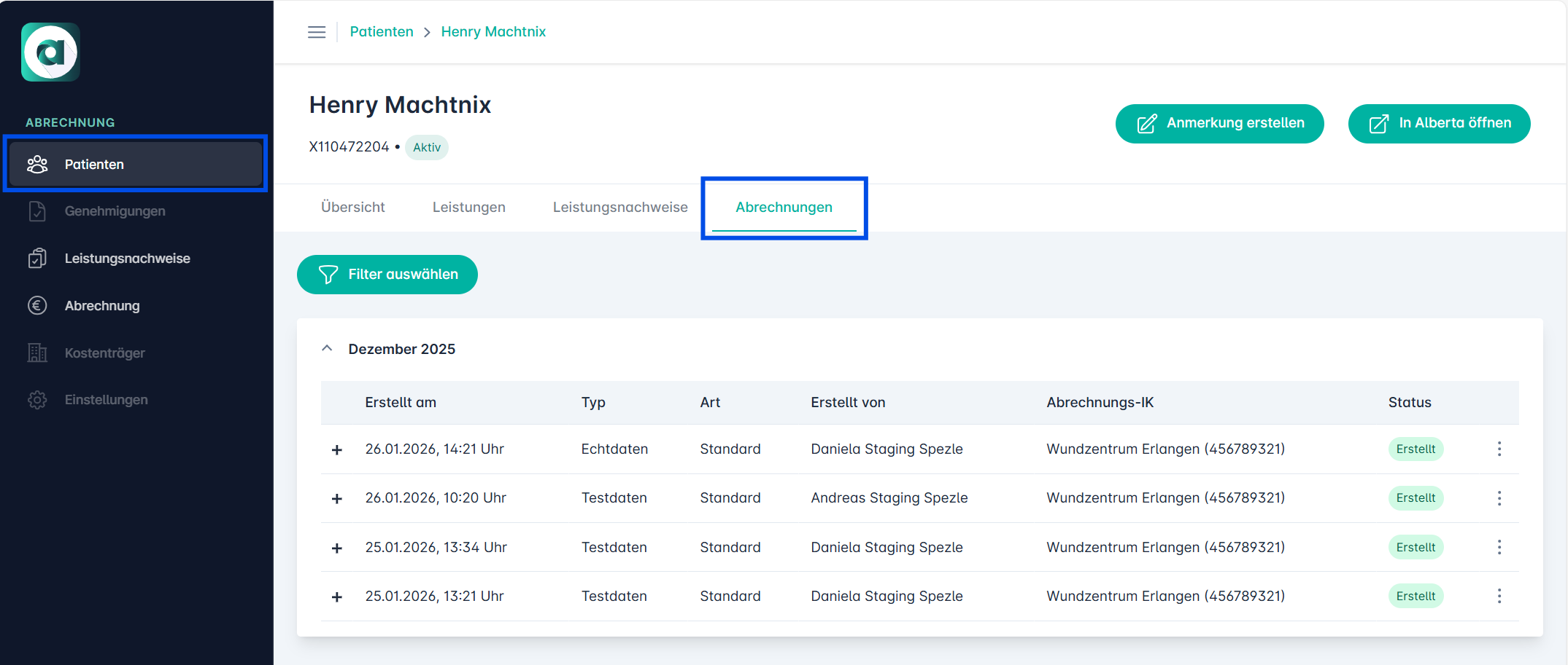 Wichtiger Hinweis: Bitte beachtet, dass in der patientenbezogenen Abrechnungsübersicht aus technischen Gründen nur Abrechnungen angezeigt werden, die ab dem 10.12.2025 erstellt wurden. Ältere Rechnungen sind weiterhin über die globale Abrechnungsübersicht einsehbar.